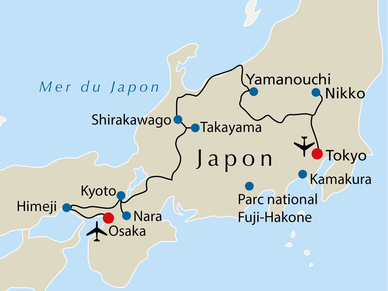 Le 9ᵉ jour, un autre point fort nous attend. Nous partons pour Himeji au « Château du Héron Blanc » (entrée comprise). Le plus grand château du Japon datant du 17ᵉ siècle. Il s‘agit à juste titre d‘un site exceptionnel du patrimoine mondial de l‘UNESCO. Il est entouré d‘un magnifique parc (entrée comprise). Ensuite, nous retournons sur l‘île aéroportuaire de Kansai. De là, il est temps de dire adieu à la magie du pays du soleil levant. Chargés de souvenirs inoubliables, nous atterrissons le 10ᵉ jour.